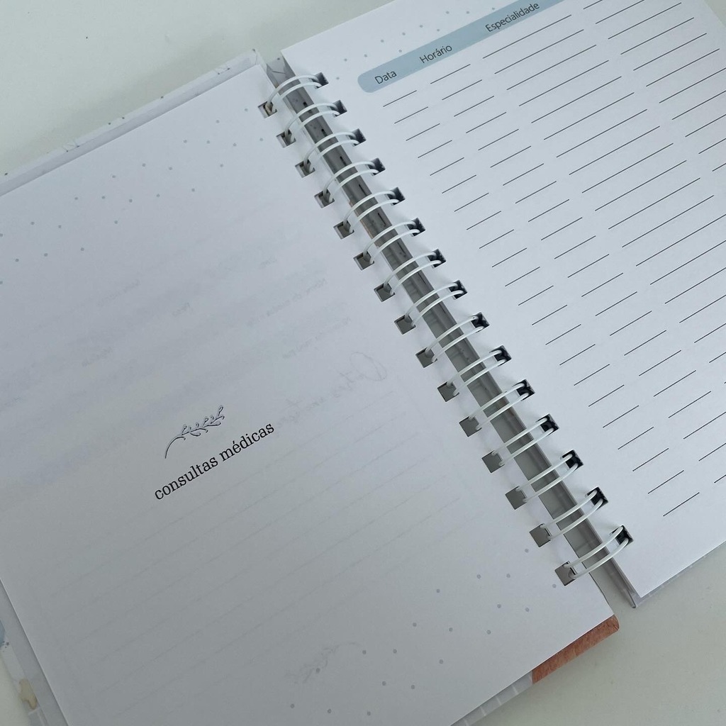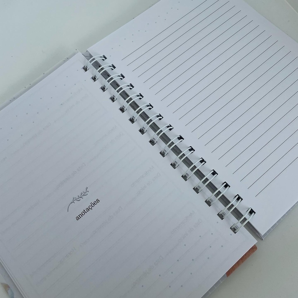 – Capa dura, tamanho 15,5×21,5cm com fechamento em elástico (em cor que combine com o tema) e encadernação com wire-o branco.