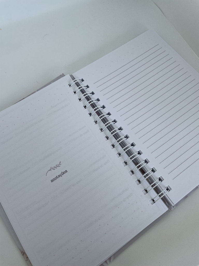 – Capa dura, tamanho 15,5×21,5cm com fechamento em elástico (em cor que combine com o tema)  e encadernação com wire-o branco.